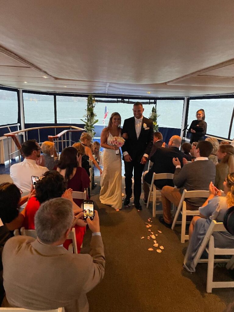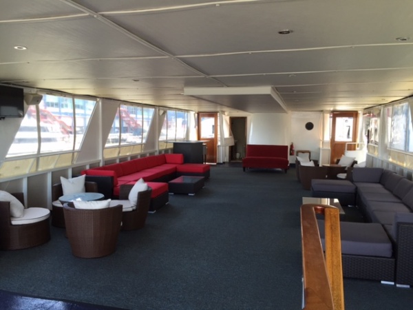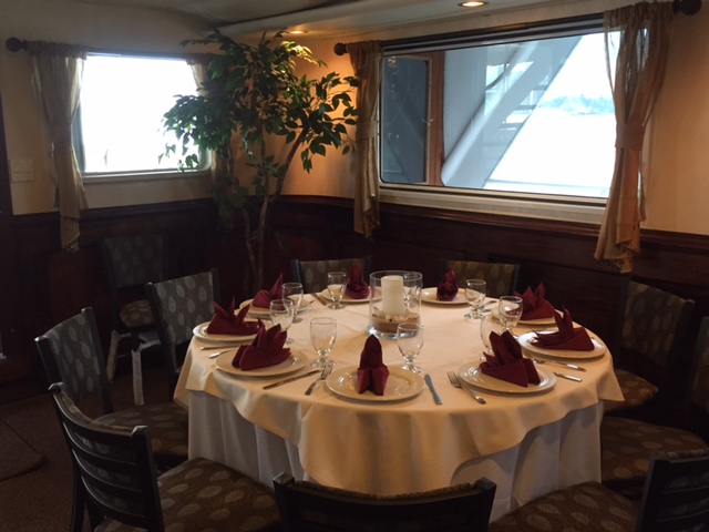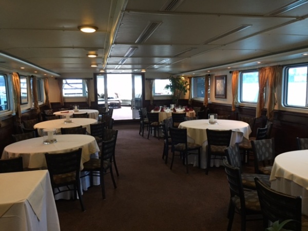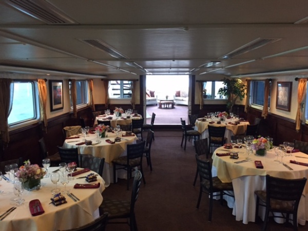 Guest boarding takes place on either the Main Deck or Upper Deck, where trays of Wine and Water are offered by the uniformed staff. The Cocktail Hour portion features hand crafted hors d’oeuvres offered butler style, followed by the Buffet Dinner, with formal seating on the Main Deck. The Salon, situated on the Second Deck, has Hamptons Style outdoor furnishings for a wonderful conversational setting. Heads are available on both decks.