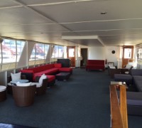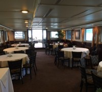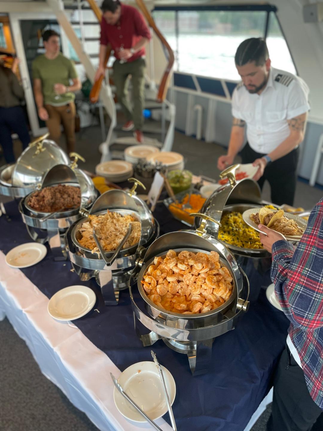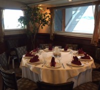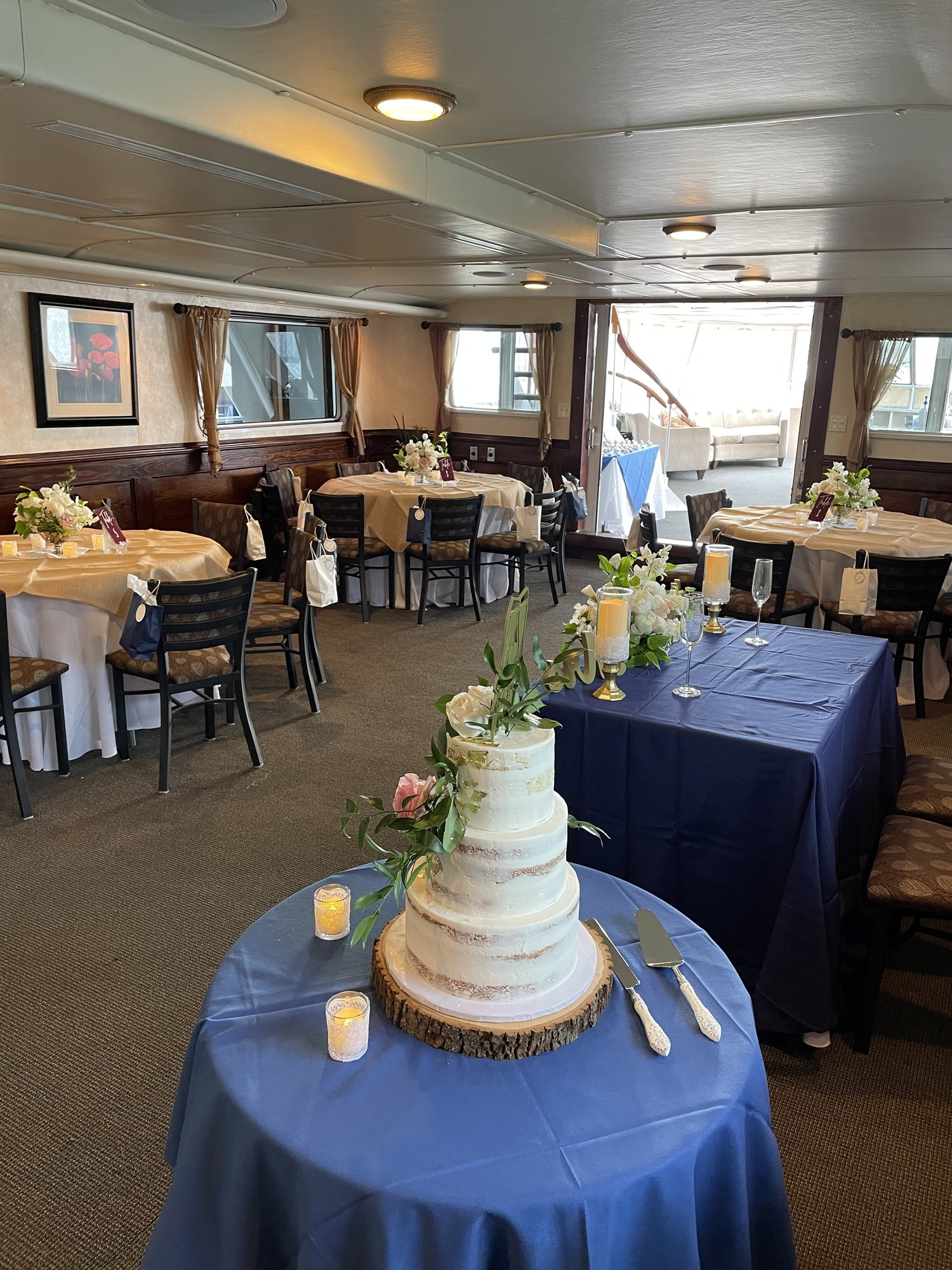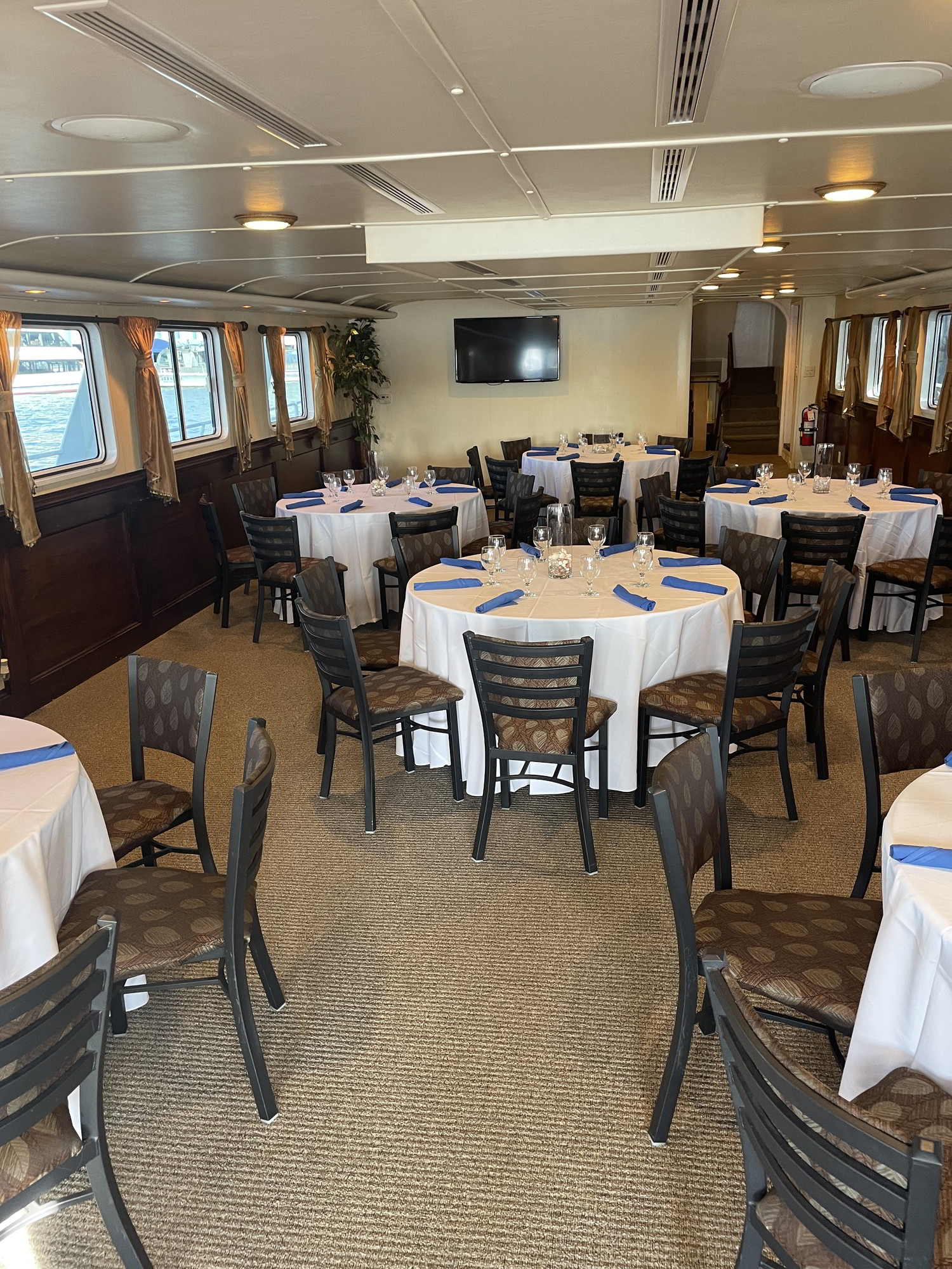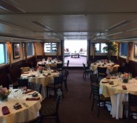 Guest boarding takes place on either the Main Deck or Upper Deck, where trays of Wine and Water are offered by the uniformed staff. The Cocktail Hour portion features hand crafted hors d’oeuvres offered butler style, followed by the Buffet Dinner, with formal seating on the Main Deck. The Salon, situated on the Second Deck, has Hamptons Style outdoor furnishings for a wonderful conversational setting. Heads are available on both decks.